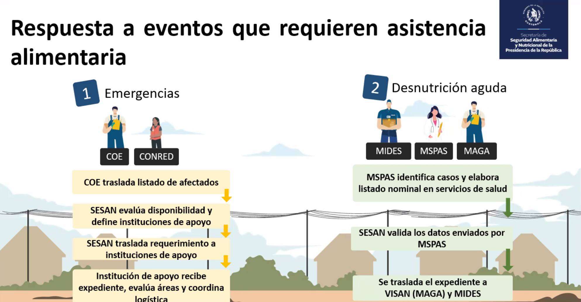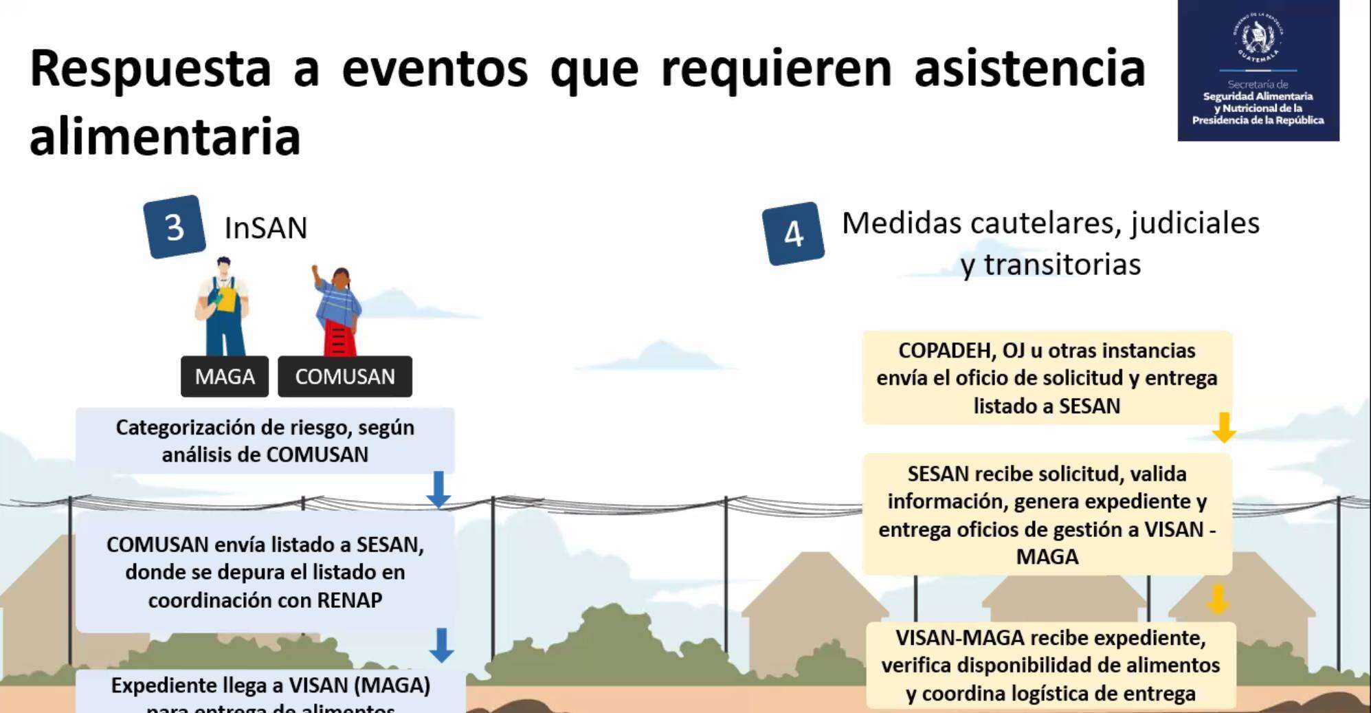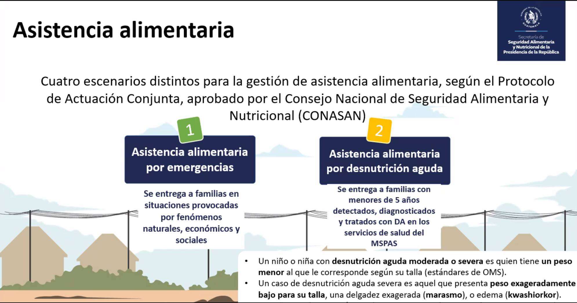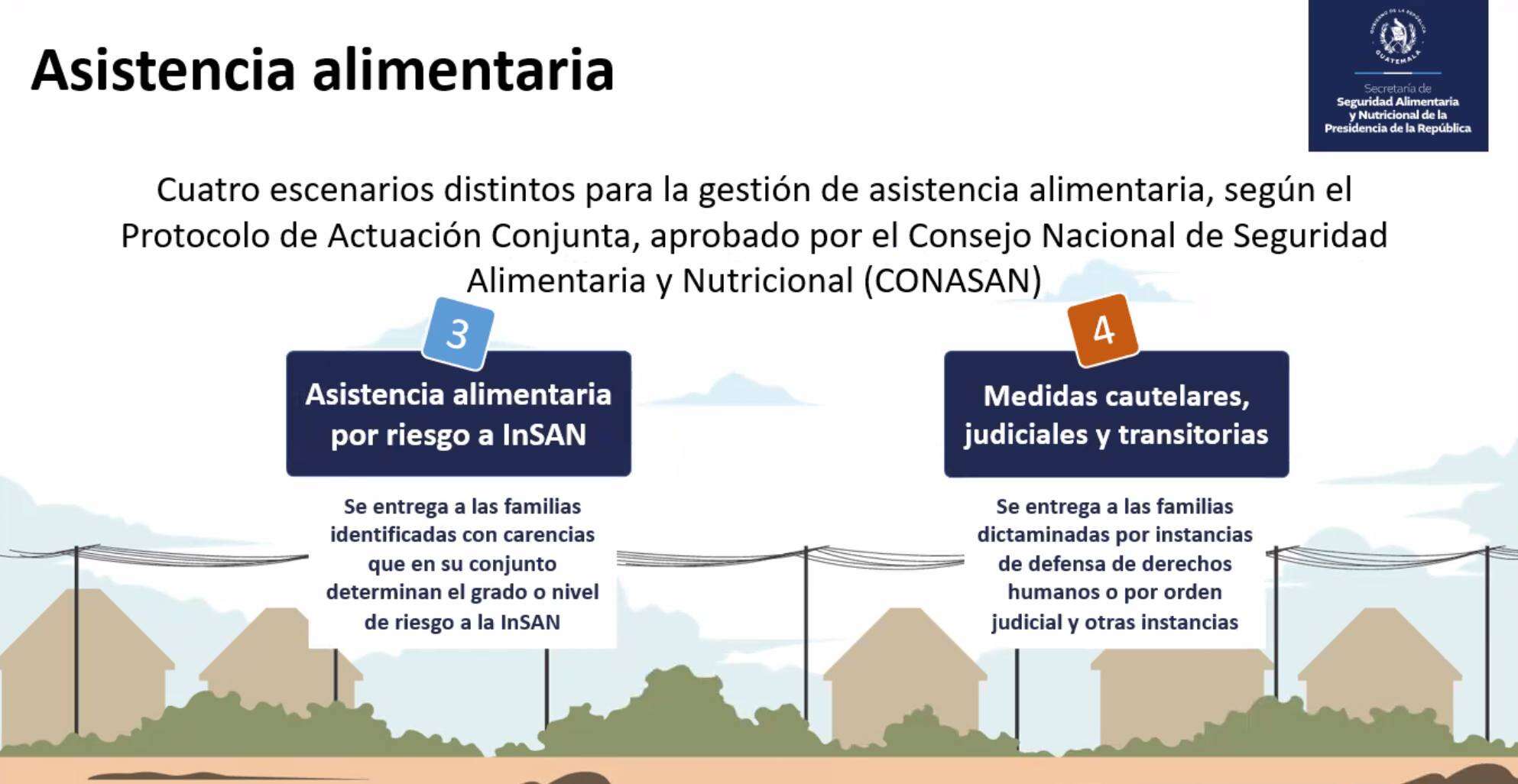 La secretaria titular de la SESAN (Secretaría de Seguridad Alimentaria y Nutricional) Mireya Palmieri explicó el día de ayer en reunión virtual los 4 diferentes escenarios para la gestión de asistencia alimentaria aprobados por el Consejo Nacional de Seguridad Alimentaria y Nutricional CONASAN, así como también detalló el proceso que se realiza ante los 4 escenarios posibles.