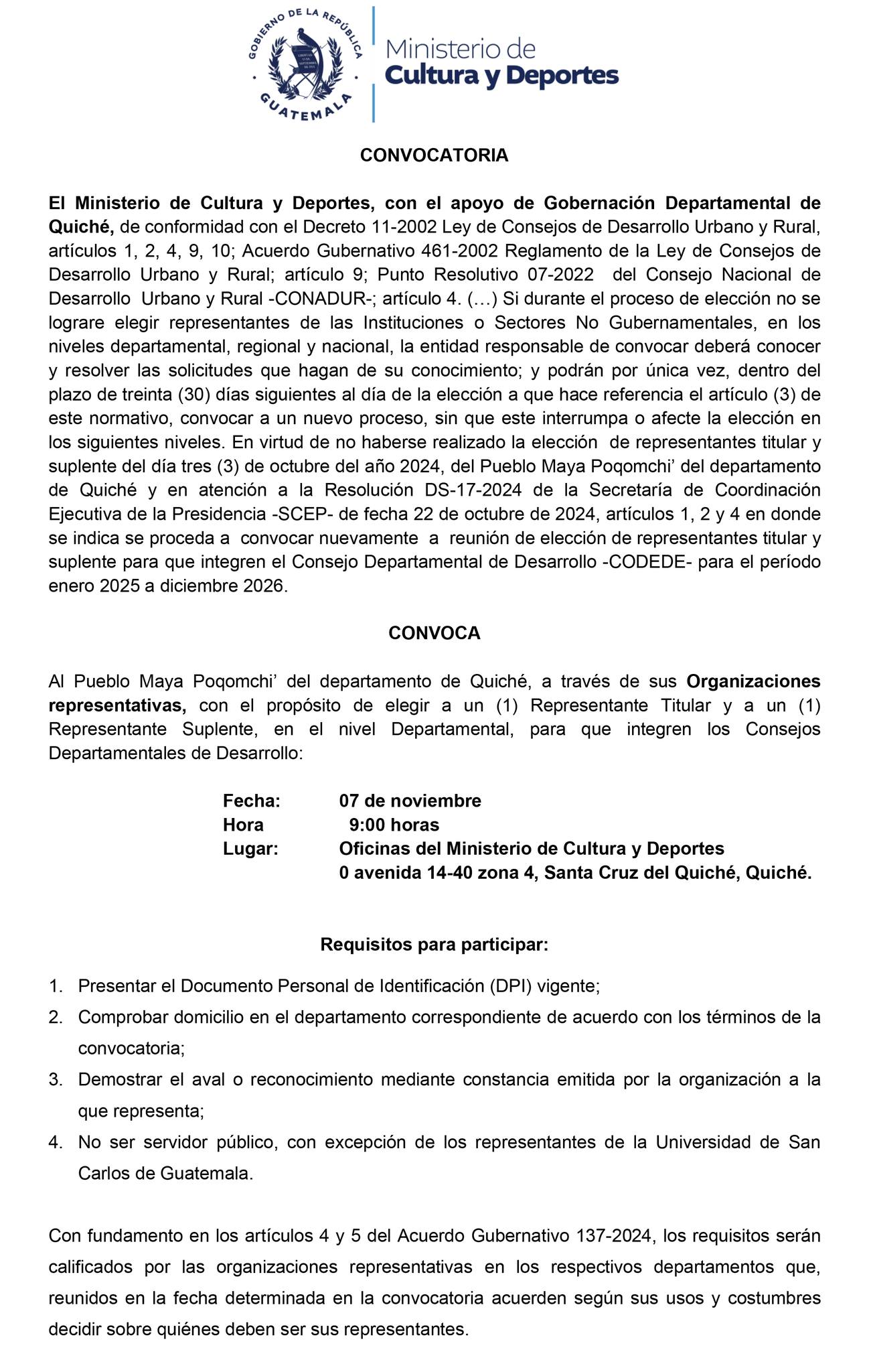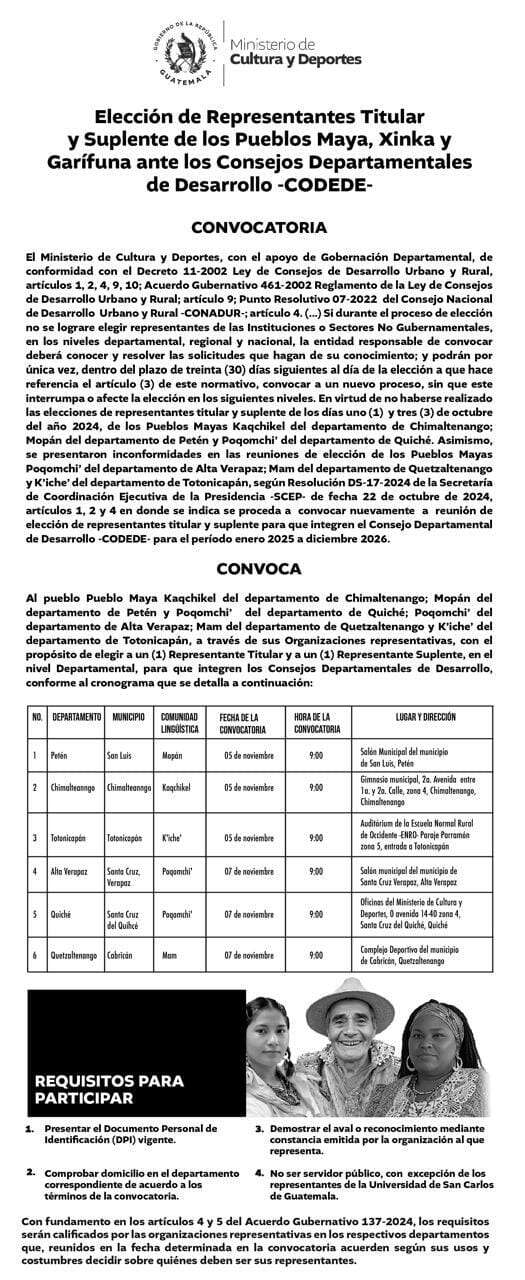 Esta elección se realizará el día 7 de noviembre de 2024 a partir de las 9:00 horas en las oficinas del Ministerio de Cultura y Deportes, 0 avenida 14-40 zona 4, Santa Cruz del Quiché, Quiché.