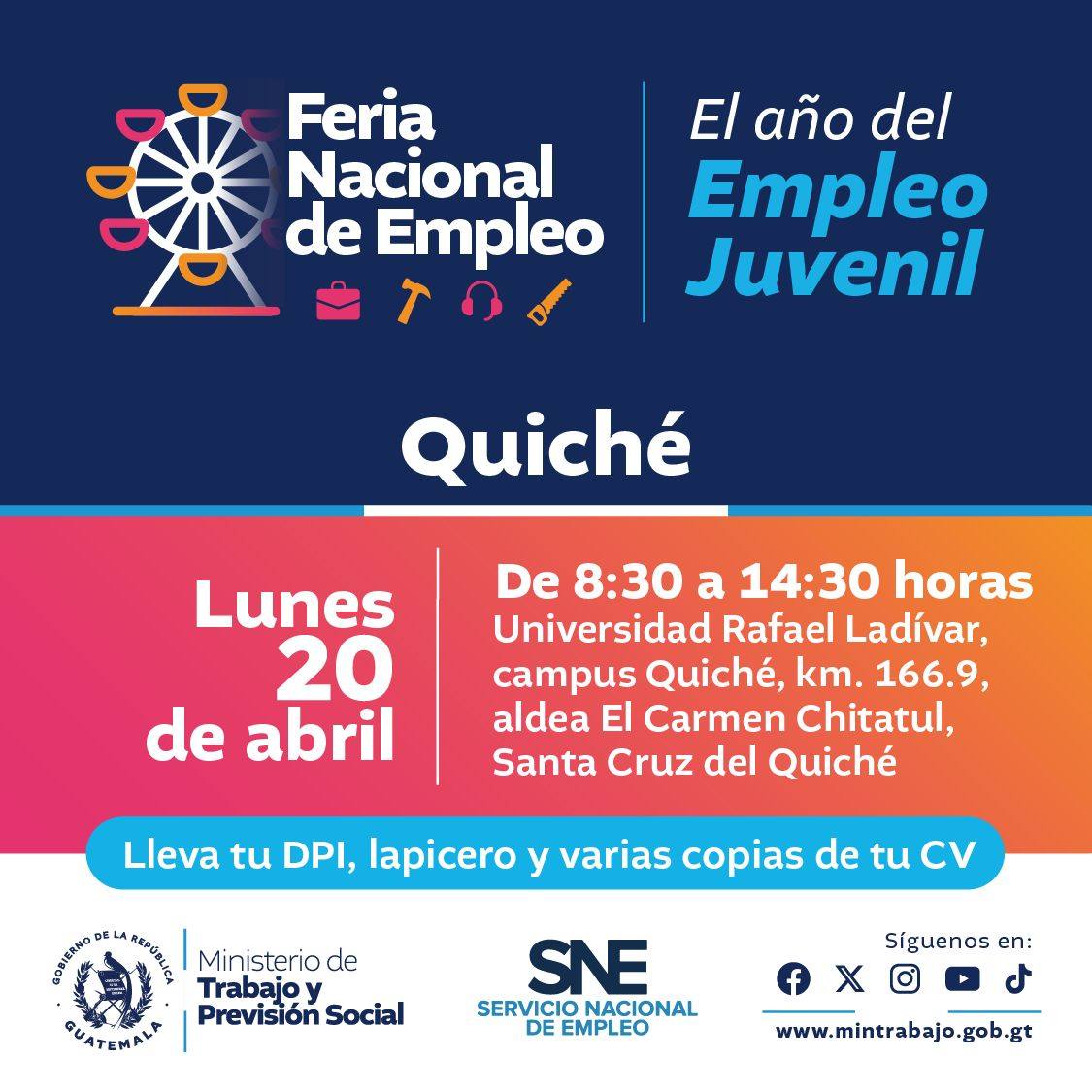 Noticias Feria Nacional del Empleo Publicado 2 días ago on abril 13, 2026 Por Milton Hernandez Temas Relacionados:portada Continue Reading También le puede interesar Gobernador Departamental de Quiché fortalece coordinación interinstitucional mediante visitas a entidades clave Cuarta sesión ordinaria del Consejo Departamental de Desarrollo -CODEDE- Quiché, presidida por el Gobernador Herman Carlos Ríos Tercera sesión ordinaria de la Unidad Técnica Departamental, presidida por el Gobernador de Quiché, Herman Carlos Ríos Sacapulas impulsa la Estrategia Intersectorial «Mano a Mano» Se inaugura la estrategia multisectorial “Mano a Mano” en Cunén, Quiché. Impulsan Estrategia “Mano a Mano” en Chicamán